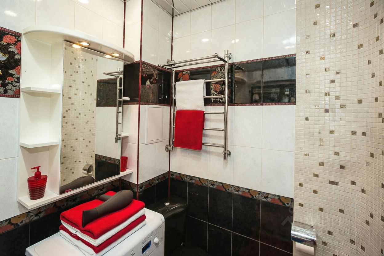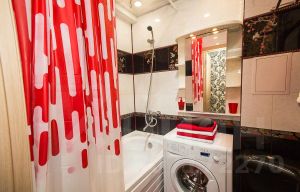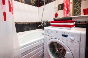 Ванная комната оснащена новой стильной сантехникой. Есть все необходимые принадлежности для личного ухода: от стиральной машины-автомат до фена.