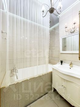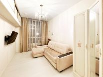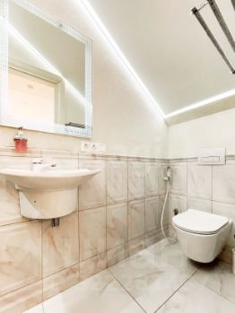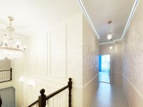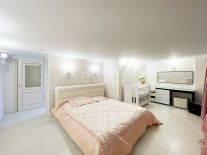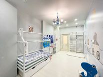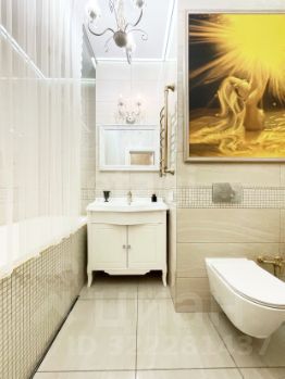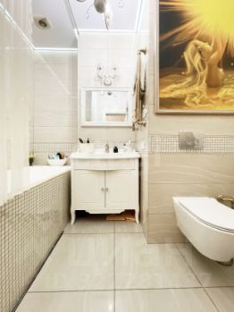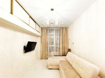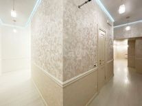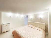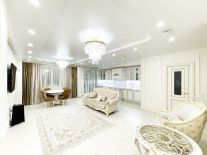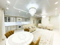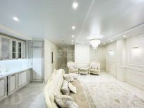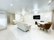 - Дизайнерский ремонт из качественных материалов: пол покрыт ламинатом, в коридорах и санузлах плитка, потолки натяжные с точечными светильниками, стены оклеены высококлассными обоями.