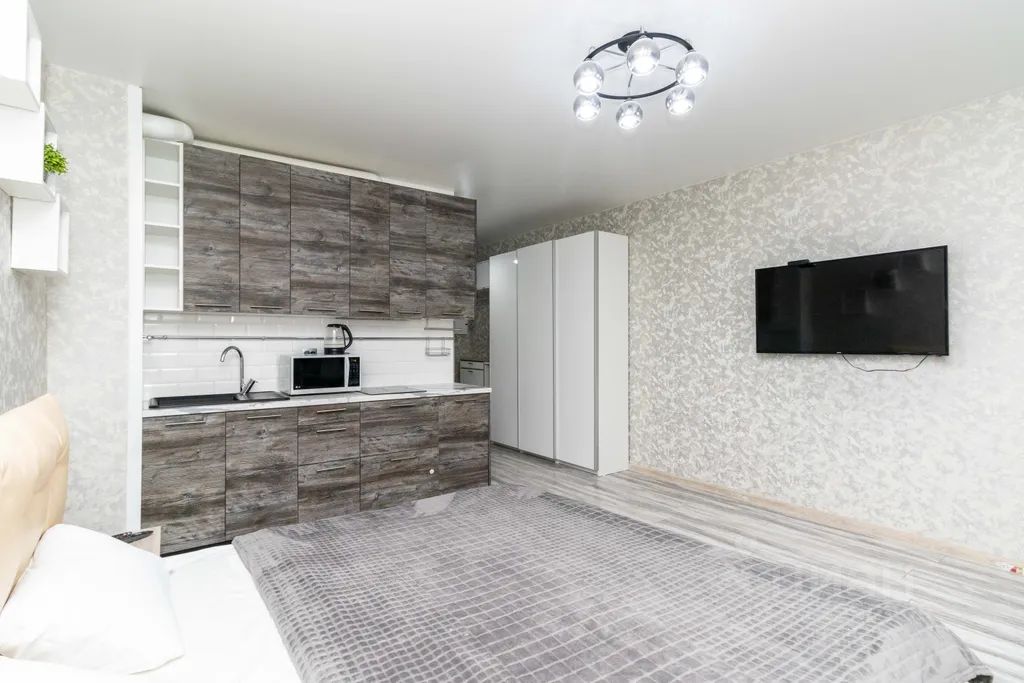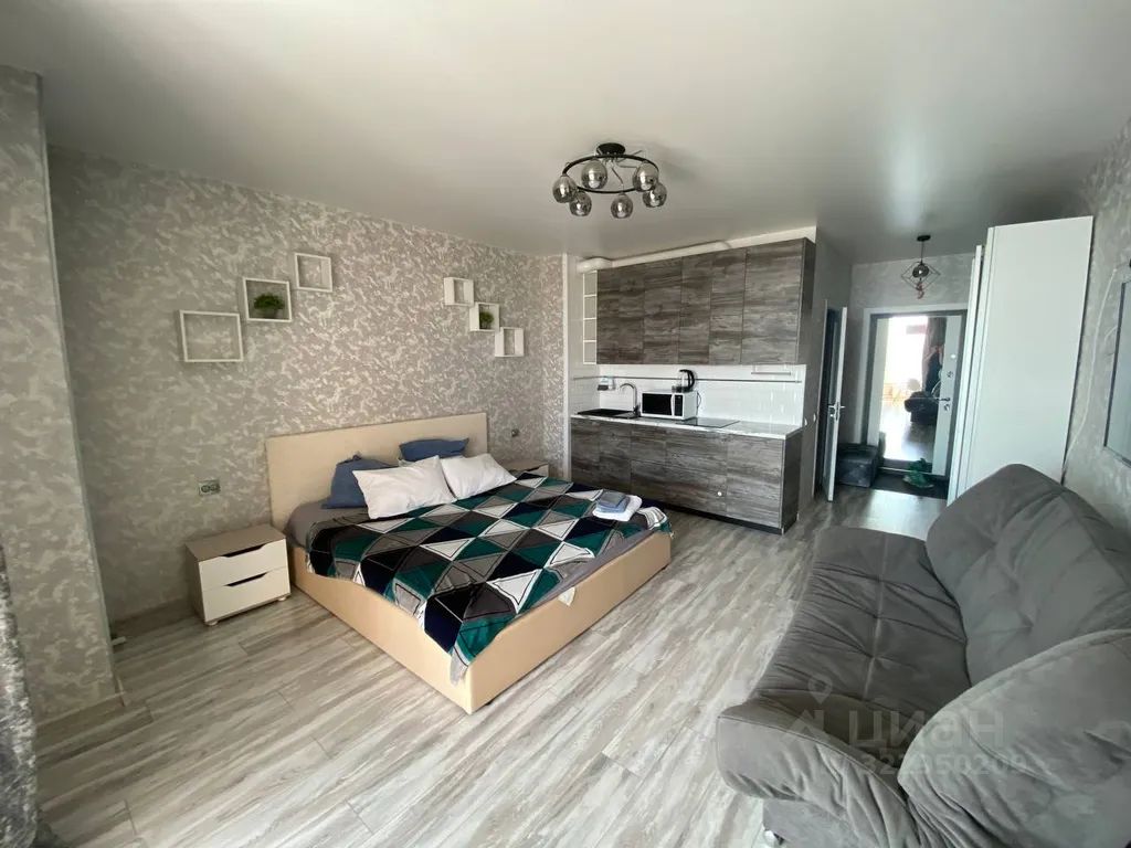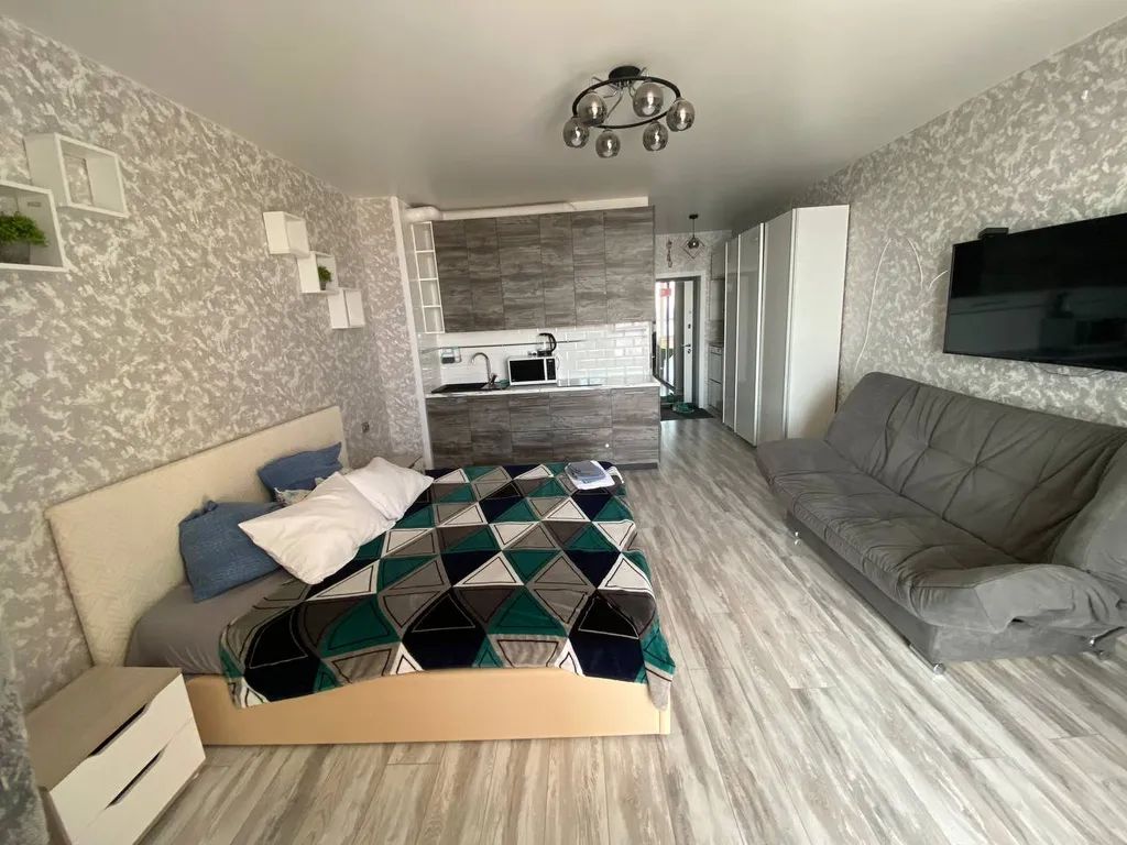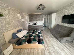Просторная однокомнатная квартира-студия с большой двуспальной кроватью с ортопедическим матрасом.