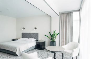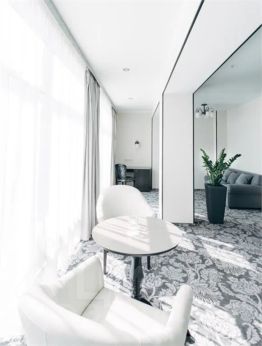Студио в темном варианте - это строгий и деловой номер, площадью 38 кв.м на 21/22 этаже отеля. Здесь массивная мебель из шпона "черный абрикос" с серебряной патиной и много дневного света. В каждом номере панорамные окна с великолепнейшим видом из окна.