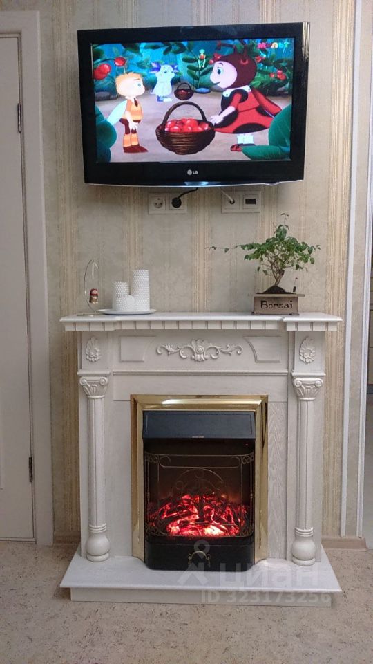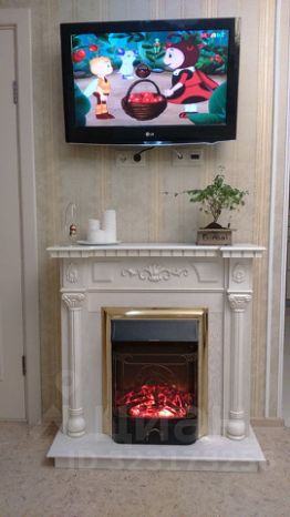Угловой диван, телевизор, камин, пианино.