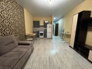 В студии есть всё необходимое для комфортного проживания: современная кухня с мебелью, холодильник, стиральная машина и ванная комната с ванной. Просторная планировка позволяет рационально использовать пространство.