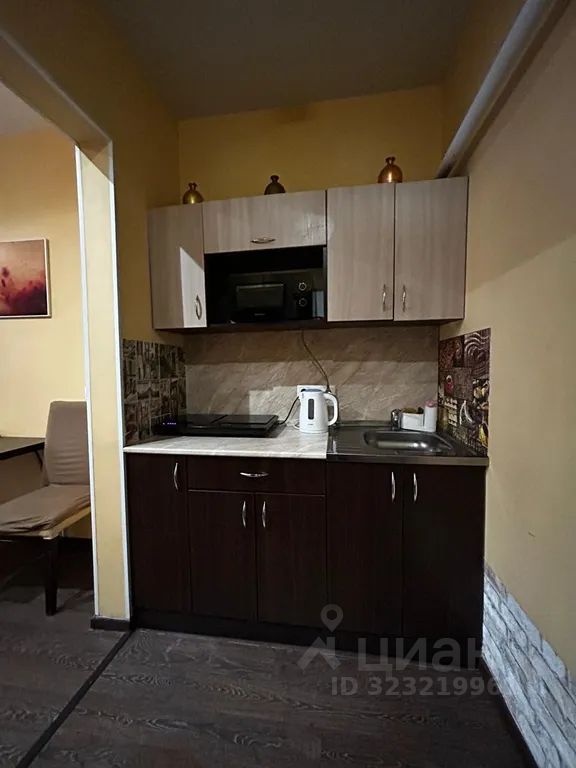 Кухня со всей необходимой техникой: холодильник, микроволновая печь, плита, чайник.