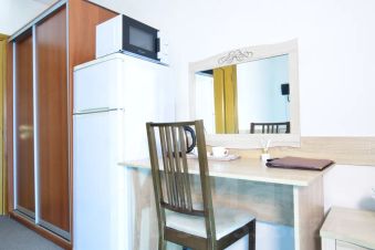Приглашаем вас оценить комфорт наших улучшенных апартаментов комфорт-класса. Каждая деталь создана для вашего удобства. В номере — телевизор 42 дюйма, холодильник, чайник и микроволновая печь для легких перекусов. Уютная кровать с матрасом и белоснежным постельным бельем гарантирует крепкий сон. В санузле с душевой кабиной — мягкие махровые полотенца и косметический набор для вашего комфорта.
