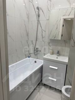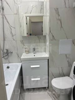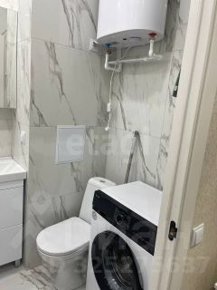 Совмещённый санузел оформлен современной плиткой и оборудован ванной и стиральной машиной.