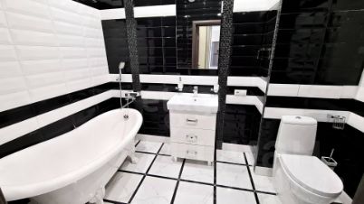 В квартире просторная кухня-гостиная и две спальни, полностью оборудованные современной мебелью. Есть большая гардеробная и все необходимое бытовое оборудование: большой холодильник, посудомоечная машина, микроволновая печь, духовой шкаф, индукционная плита, стиральная машина, кондиционеры и бойлер. Техника дополняется двумя телевизорами, а также двумя санузлами — душевые кабины и ванная.