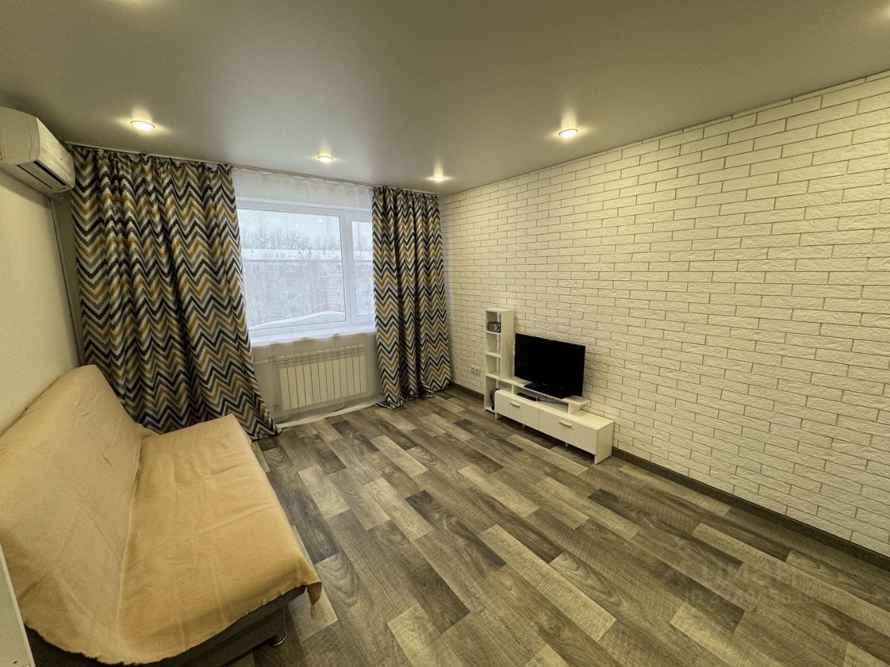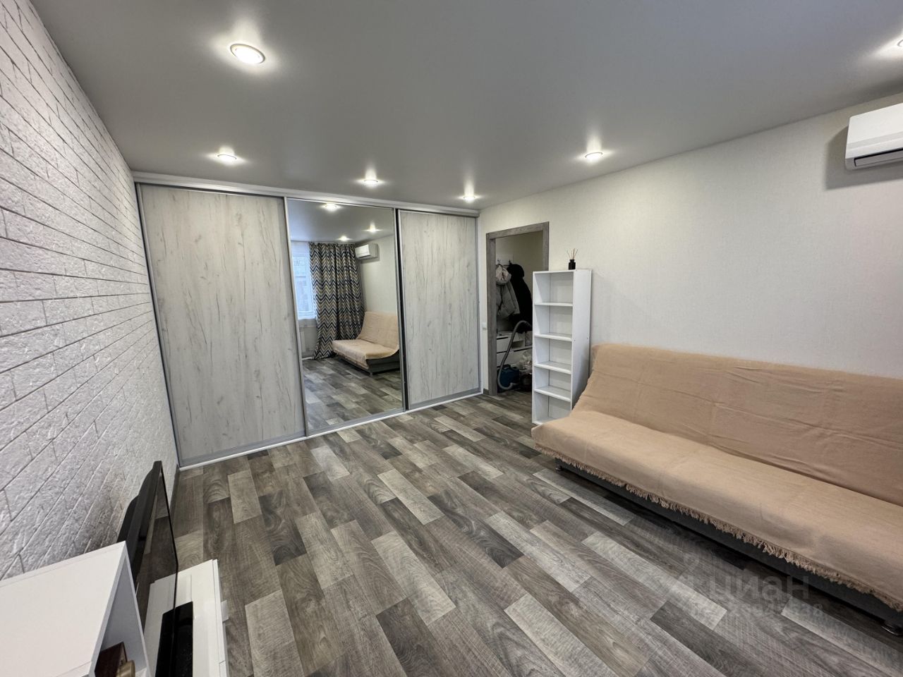 В комнате установлен кондиционер, а также телевизор. Удобный диван и вместительный шкаф-купе.