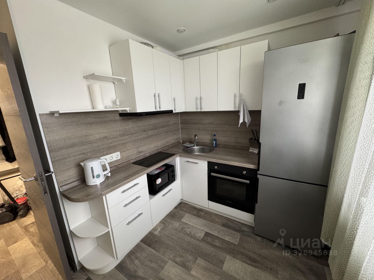 Просторная кухня оборудована всем необходимым: холодильник, плита, микроволновая печь, чайник.