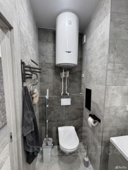 Ванная комната совмещенная, оформлена в современном стиле с душевой кабиной, бойлером и стиральной машиной.