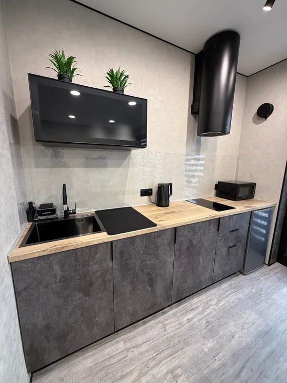 - кухня: холодильник, микроволновка, чайник, варочная панель, вытяжка, набор посуды.
