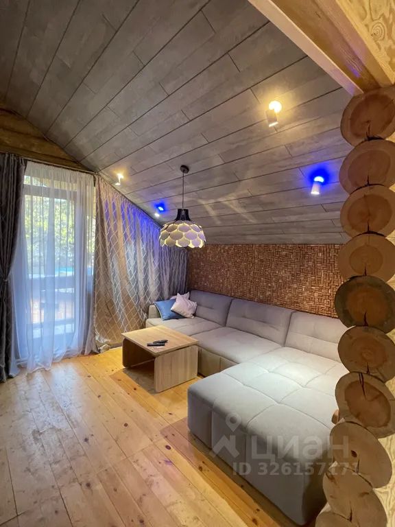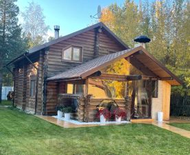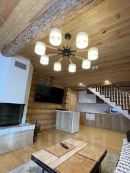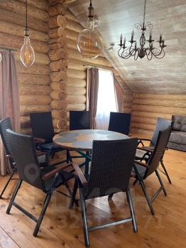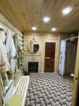 К вашим услугам: гостиная с камином и оборудованной кухней и несколькими зонами отдыха: на улице — крытая терраса с мангалом и большим столом на 8-10 человек; у камина на большом диване — прекрасное место отдыха после бани; на втором этаже в большой гостиной под высоким сводом крыши — лаундж-зона с диваном и телевизором; открытый балкон с красивым видом на лес и озеро.