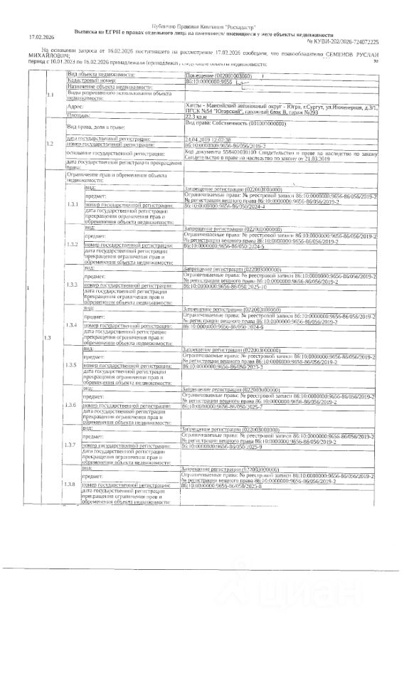 Должник: Семенов Р.М., собственник: Семенов Р.М. Лот: Нежилое помещение (гараж), площадь 22,3 кв.м., кадастровый номер: 86:10:0000000:9656, г. Сургут ул. Инженерная, д. 3/1, ПГСК 54 "Югорский", гаражный блок В, гараж 293, н/ц: 454900 р., з-к: 68235 р., код: 0001, рег. 26-119;