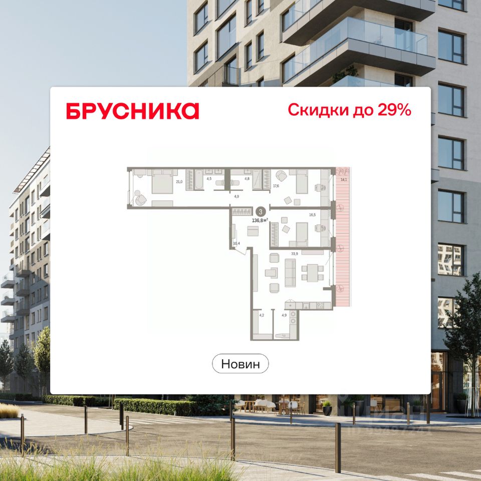 Продается 3-комн. квартира от застройщика с предчистовой отделкой в ЖК "Новин" на 2 этаже. Общая площадь: 136.8 кв.м., жилая: 55.1 кв.м., площадь просторной кухни-гостиной: 33.9 кв.м. Квартира - распашонка, без проходных комнат, окна выходят на paзные стороны дома. В квартире один балкон, два совмещенных санузла. Терраса площадью 14.1 кв.м. представляет собой роскошную зону отдыха, где вы на свой вкус можете создать атмосферу комфорта и уюта. Высота потолков 2.74 м.