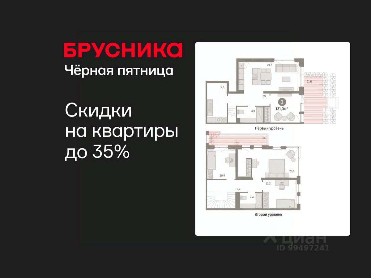 Двухуровневая квартира с кухней-гостиной и тремя спальнями в квартале "Новин". Особенности планировки: второй санузел, гардеробная, двухуровневая, предчистовая отделка, терраса, постирочная, балкон.