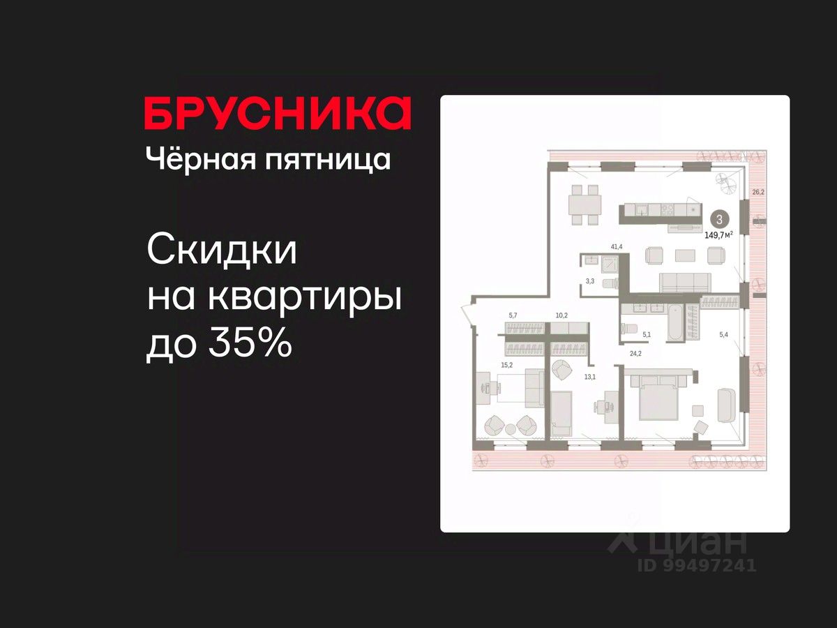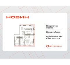 Квартира с кухней-гостиной и тремя спальнями в квартале "Новин". Особенности планировки: гардеробная, предчистовая отделка, мастер-спальня, терраса на крыше.