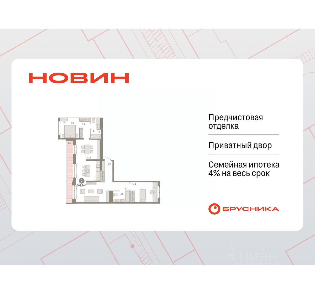 Квартира с кухней-гостиной и двумя спальнями в квартале "Новин". Особенности планировки: второй санузел, гардеробная, окна на две стороны, предчистовая отделка, разнесённые спальни, терраса.