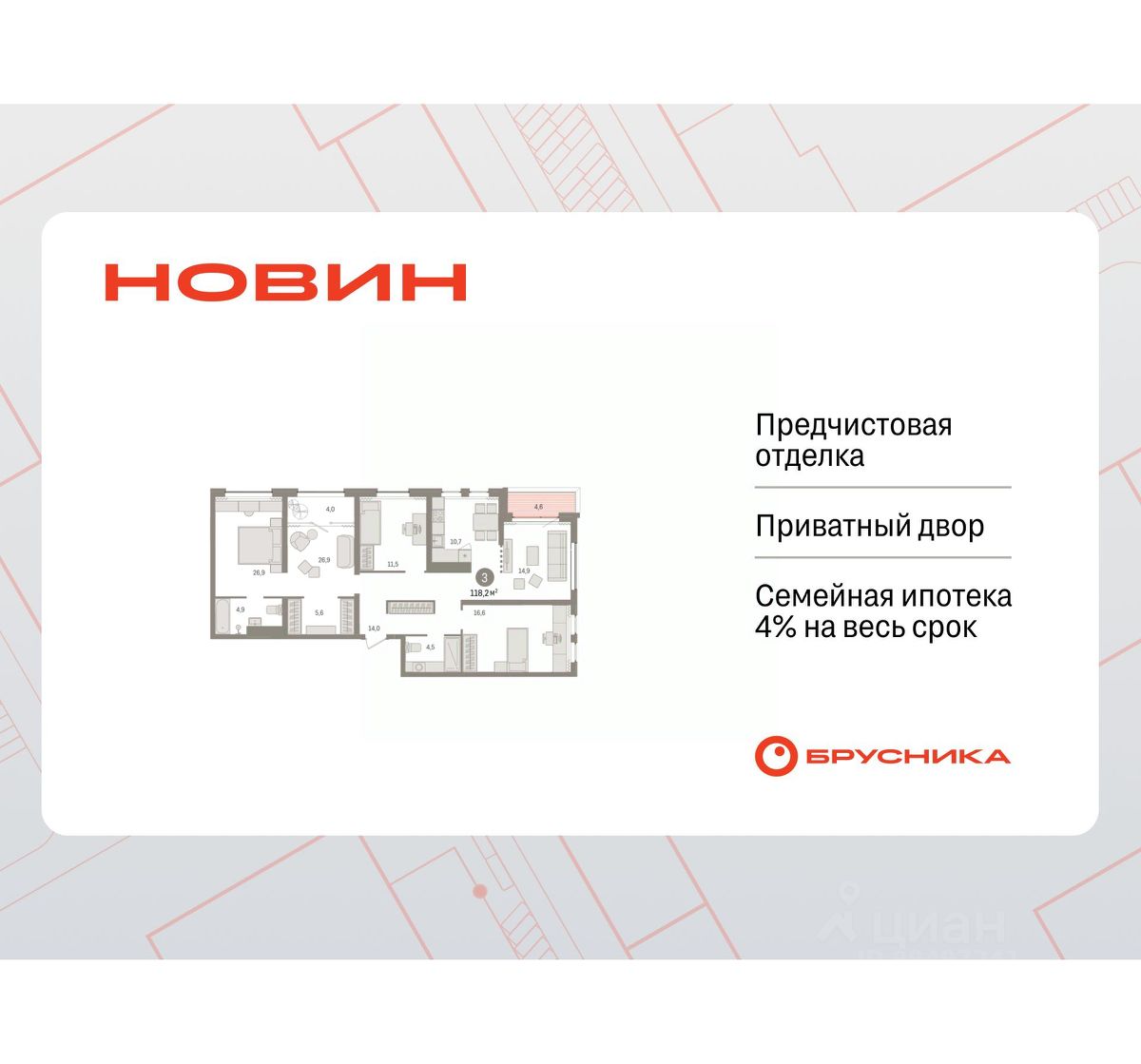 Просторная 4-комн. квартира с предчистовой отделкой в ЖК "Новин" на 6 этаже. Общая площадь: 118.19 кв.м., жилая: 81.9 кв.м., площадь просторной кухни-гостиной: 25.6 кв.м. Угловая квартира, идеально подойдет любителям тишины и панорамных видов. В квартире две лоджии, два совмещенных санузла. Высота потолков 2.74 м.