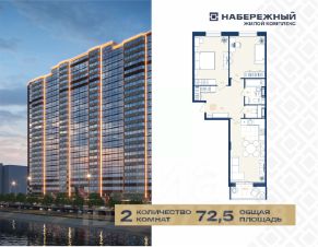 Продается уютная двухкомнатная видовая квартира 202 площадью 72,5 кв.м. с большой лоджией и кухней-гостиной площадью 16,1 кв.м., двумя комнатами площадью 14,2 м2, и 15,9 м2, в жилом комплексе "Набережный". Общая площадь квартиры — 72,5 кв.м., жилая — 46,2 кв.м. Это идеальное место для комфортной жизни вашей семьи!