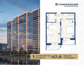 Продается уютная однокомнатная видовая квартира 293 площадью 47,6 кв.м. с двумя лоджиями и просторной кухней-гостиной площадью 18 кв.м., в жилом комплексе "Набережный". Общая площадь квартиры — 47,6 кв.м., жилая — 28,8 кв.м. Это идеальное место для комфортной жизни вашей семьи!