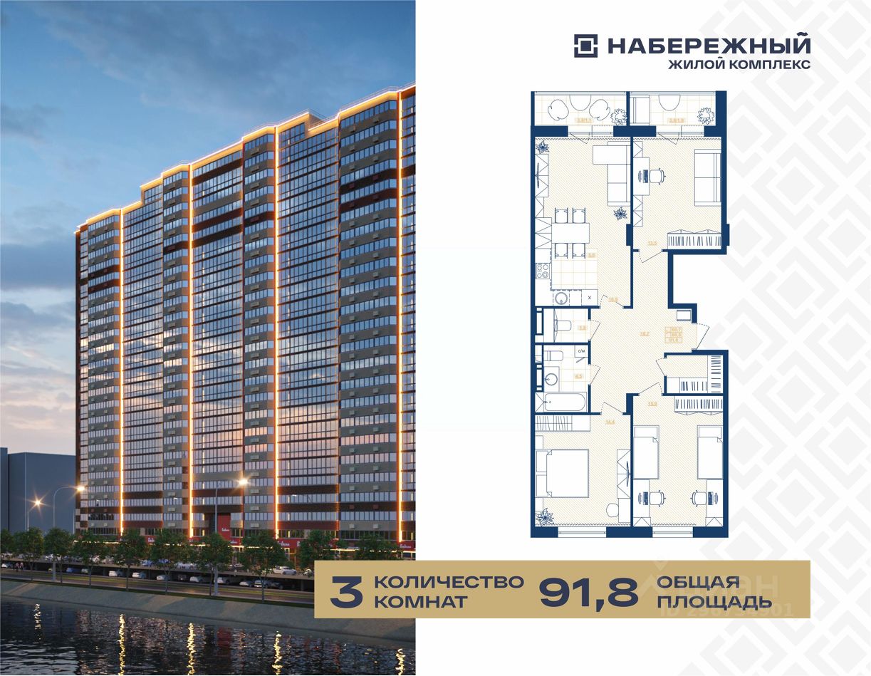 Продается уютная трехкомнатная видовая квартира 213 площадью 91,8 кв.м. с большой лоджией, гардеробной и кухней-гостиной площадью 16,9 кв.м., тремя комнатами площадью 15,9 м2, 14,4 м2, и 13,5 м2, в жилом комплексе "Набережный". Общая площадь квартиры — 91,8 кв.м., жилая — 60,7 кв.м. Это идеальное место для комфортной жизни вашей семьи!