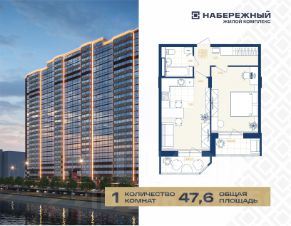 Продается уютная однокомнатная видовая квартира 328 площадью 47,6 кв.м. с двумя лоджиями и просторной кухней-гостиной площадью 18 кв.м., в жилом комплексе "Набережный". Общая площадь квартиры — 47,6 кв.м., жилая — 28,8 кв.м. Это идеальное место для комфортной жизни вашей семьи!