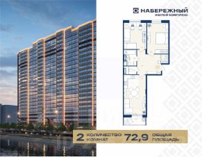 Продается уютная двухкомнатная видовая квартира 50 площадью 72,9 кв.м. с большой лоджией и кухней-гостиной площадью 16,3 кв.м., двумя комнатами площадью 14,4 м2, и 15,9 м2, в жилом комплексе "Набережный". Общая площадь квартиры — 72,9 кв.м., жилая — 46,6 кв.м. Это идеальное место для комфортной жизни вашей семьи!