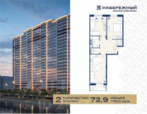 Продается уютная двухкомнатная видовая квартира 245 площадью 72,9 кв.м. с большой лоджией и кухней-гостиной площадью 16,3 кв.м., двумя комнатами площадью 14,4 м2, и 15,9 м2, в жилом комплексе "Набережный". Общая площадь квартиры — 72,9 кв.м., жилая — 46,6 кв.м. Это идеальное место для комфортной жизни вашей семьи!