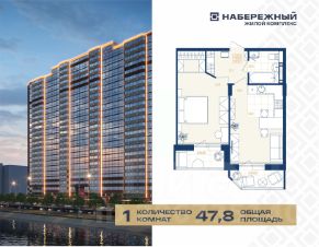 Продается уютная однокомнатная видовая квартира 156 площадью 47,8 кв.м. с двумя лоджиями и просторной кухней-гостиной площадью 18 кв.м., в жилом комплексе "Набережный". Общая площадь квартиры — 47,8 кв.м., жилая — 30,6 кв.м. Это идеальное место для комфортной жизни вашей семьи!