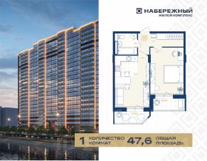 Продается уютная однокомнатная видовая квартира 163 площадью 47,6 кв.м. с двумя лоджиями и просторной кухней-гостиной площадью 18 кв.м., в жилом комплексе "Набережный". Общая площадь квартиры — 47,6 кв.м., жилая — 28,8 кв.м. Это идеальное место для комфортной жизни вашей семьи!