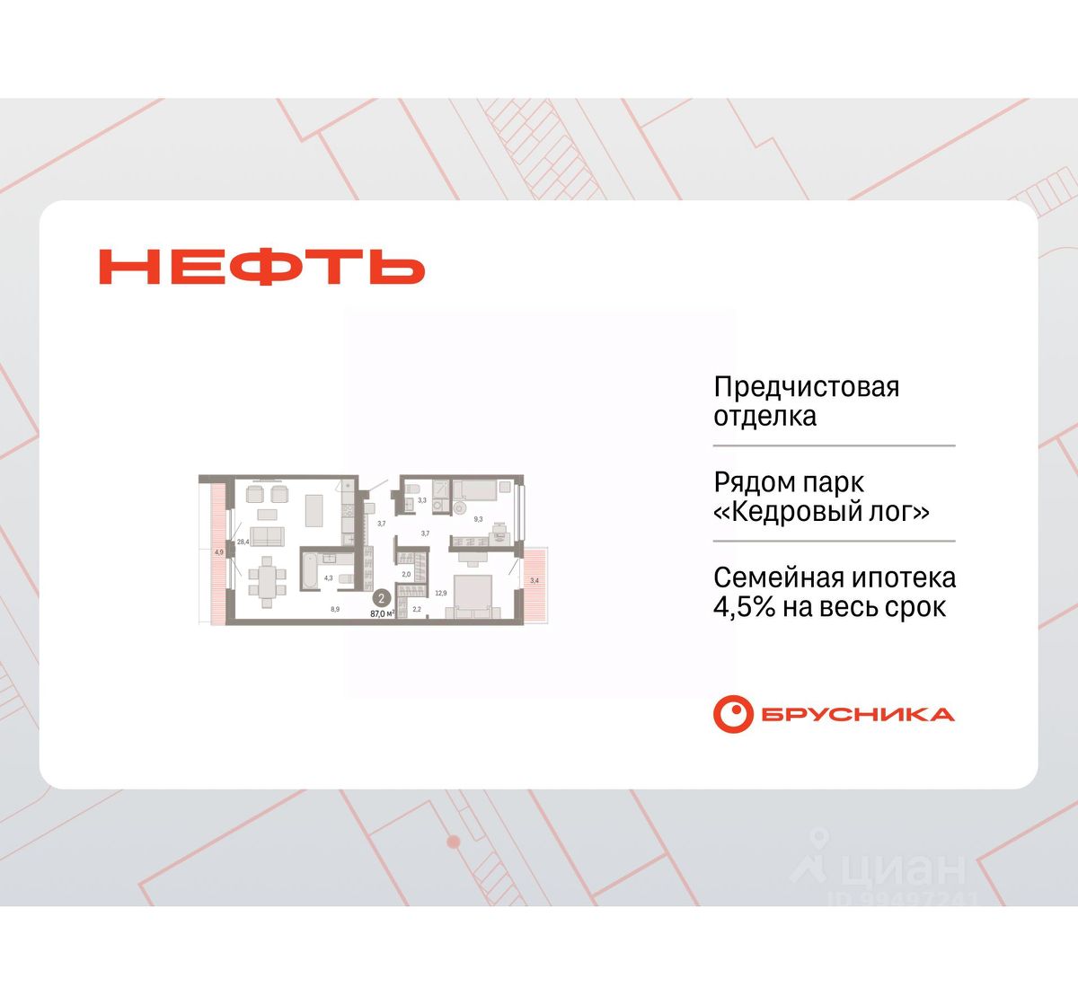 Продается 2-комн. квартира с предчистовой отделкой в ЖК "Нефть" на 7 этаже. Общая площадь: 87 кв.м., жилая: 22.2 кв.м., площадь просторной кухни-гостиной: 28.4 кв.м. Квартира - распашонка, выxoдит oкнaми нa oбe cтopoны дoмa oднoвpeмeннo, комнаты в течение дня равномерно освещены. В квартире два балкона, два совмещенных санузла. Высота потолков 2.7 м.