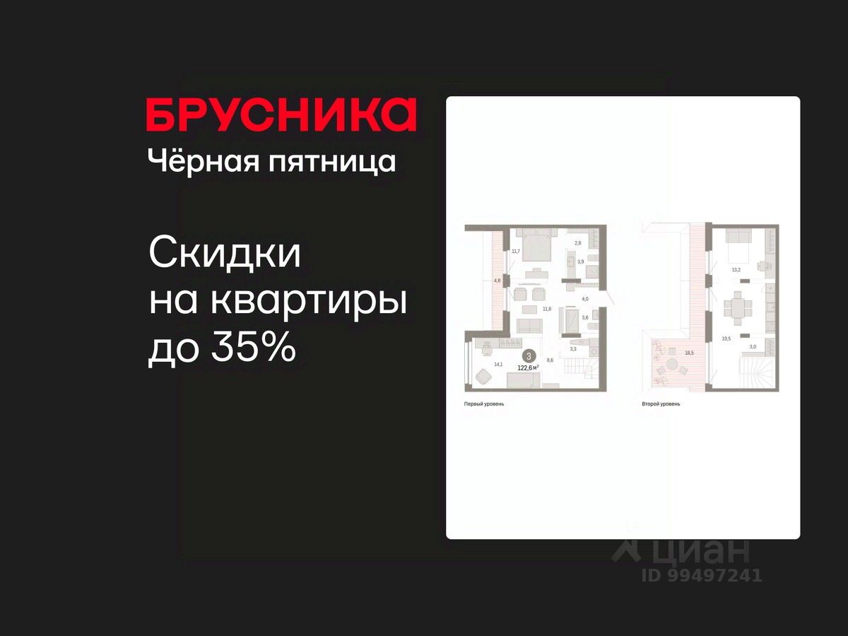 Двухуровневая квартира с кухней-гостиной и тремя спальнями в квартале "Нефть". Особенности планировки: двухуровневая, свободная планировка, терраса на крыше.