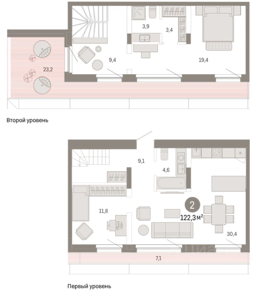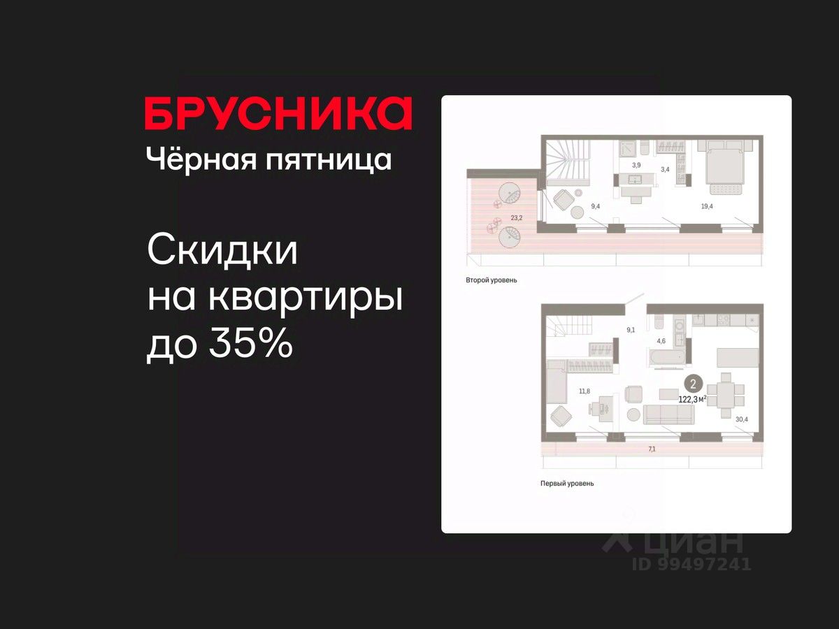 Двухуровневая квартира с кухней-гостиной и двумя спальнями в квартале "Нефть". Особенности планировки: двухуровневая, свободная планировка, терраса на крыше.