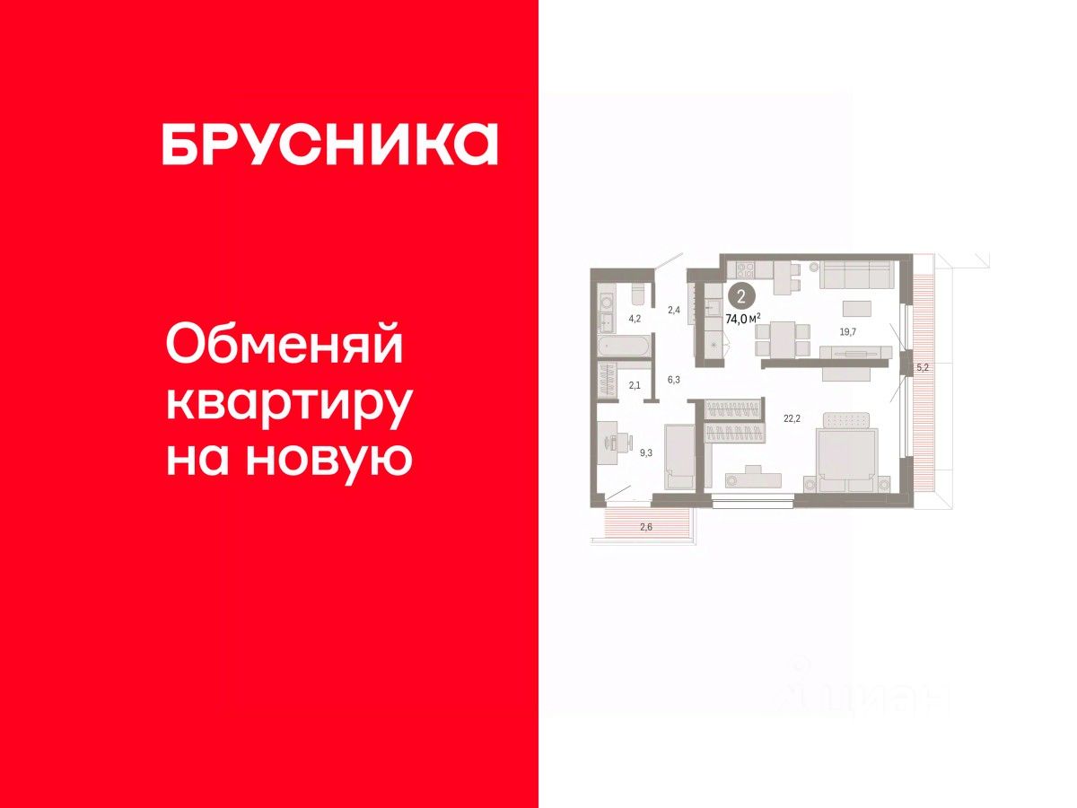 Квартира с кухней-гостиной и двумя спальнями в квартале "Нефть". Особенности планировки: балкон, предчистовая отделка, терраса на крыше.