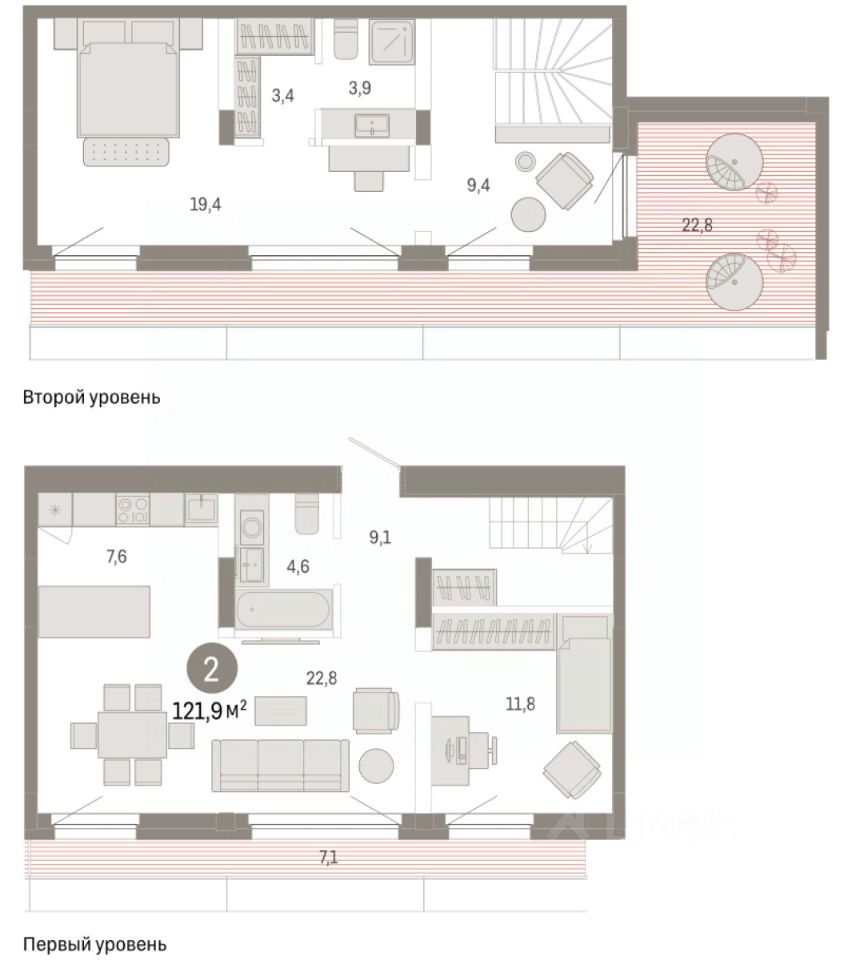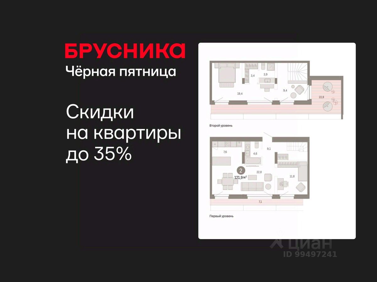 Двухуровневая квартира с кухней-гостиной и двумя спальнями в квартале "Нефть". Особенности планировки: двухуровневая, свободная планировка, терраса на крыше.