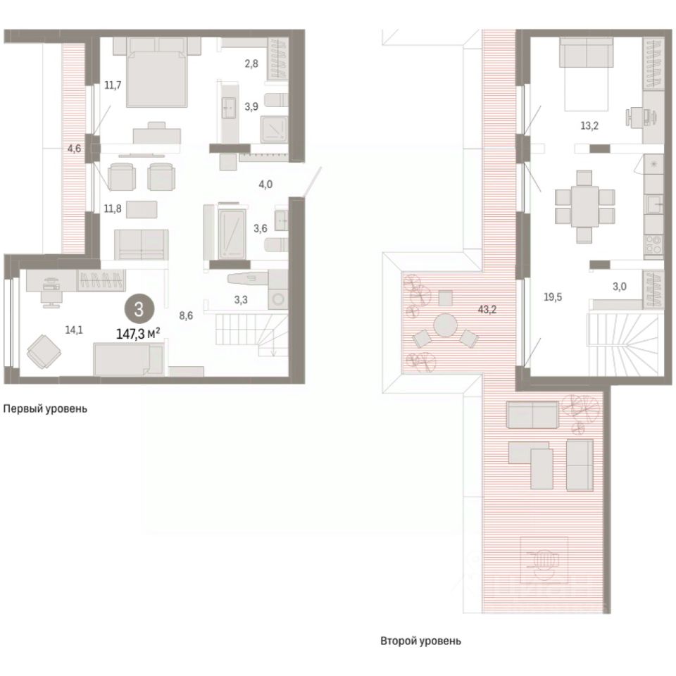 Двухуровневая квартира с кухней-гостиной и тремя спальнями в квартале "Нефть". Особенности планировки: двухуровневая, свободная планировка, терраса на крыше.