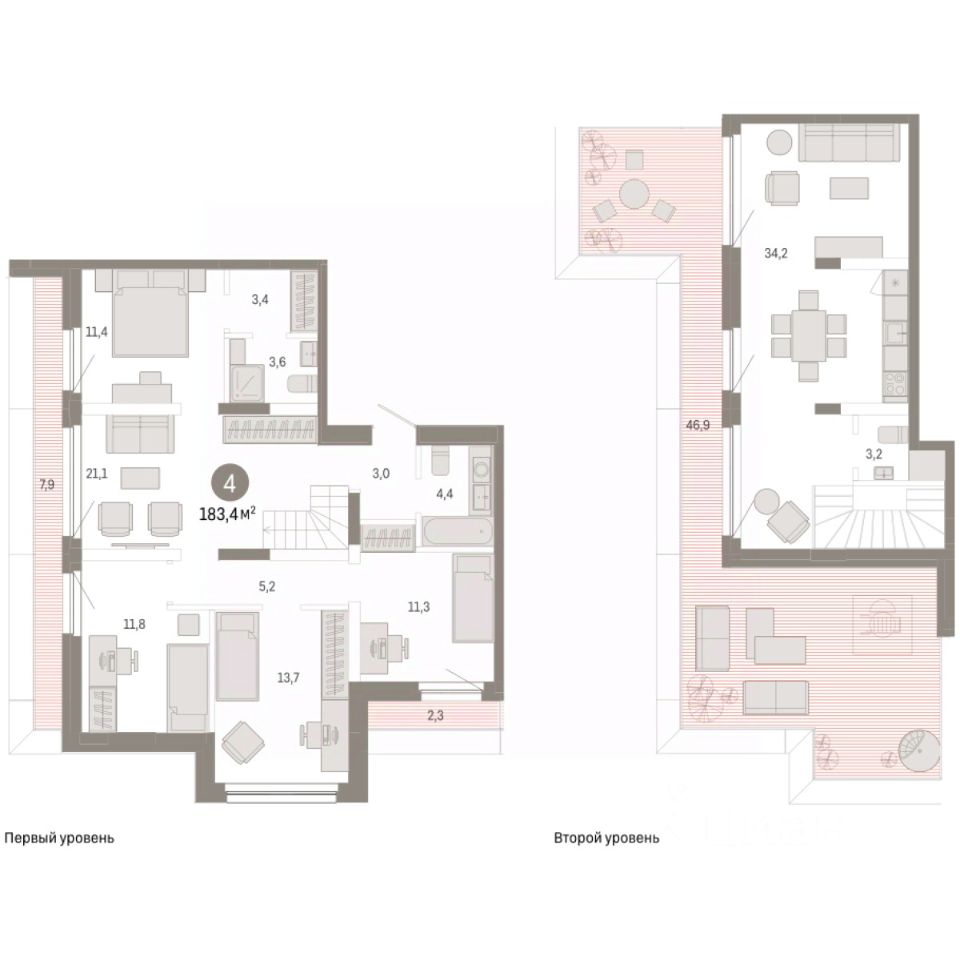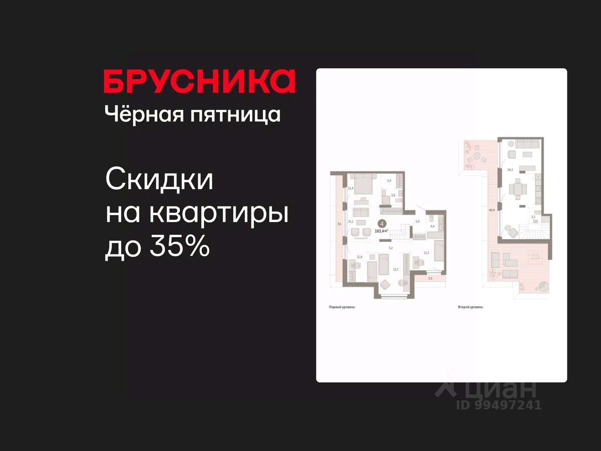 Двухуровневая квартира с кухней-гостиной и четырьмя спальнями в квартале "Нефть". Особенности планировки: двухуровневая, свободная планировка, терраса на крыше.