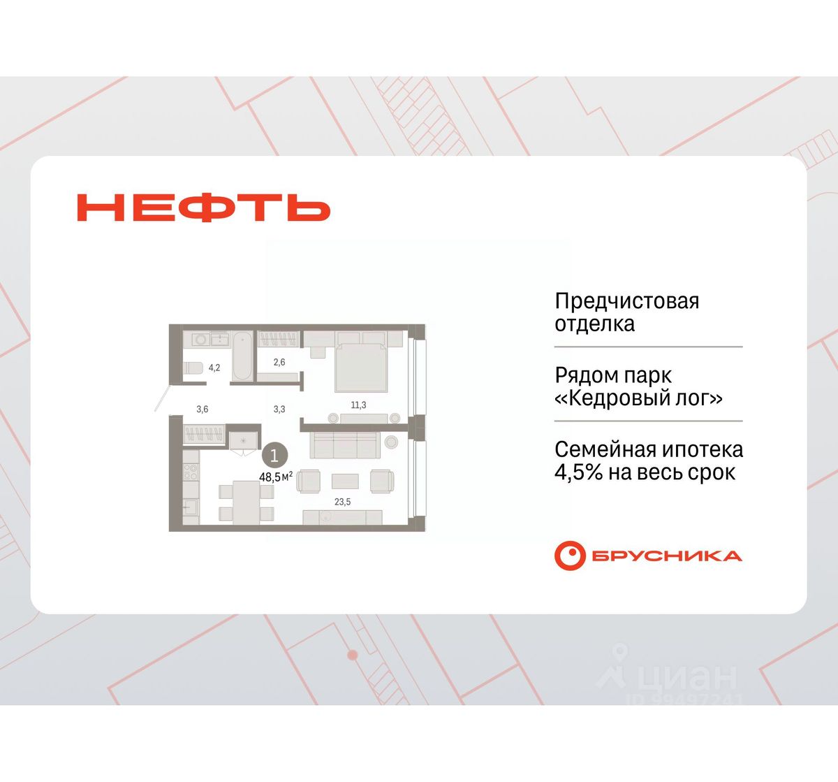 1-комн. квартира от застройщика с предчистовой отделкой в ЖК "Нефть" на 2 этаже. Общая площадь: 48.5 кв.м., жилая: 11.3 кв.м., площадь просторной кухни-гостиной: 23.5 кв.м. Все окна выходят на одну сторону. В квартире один совмещенный санузел. Высота потолков 2.7 м.