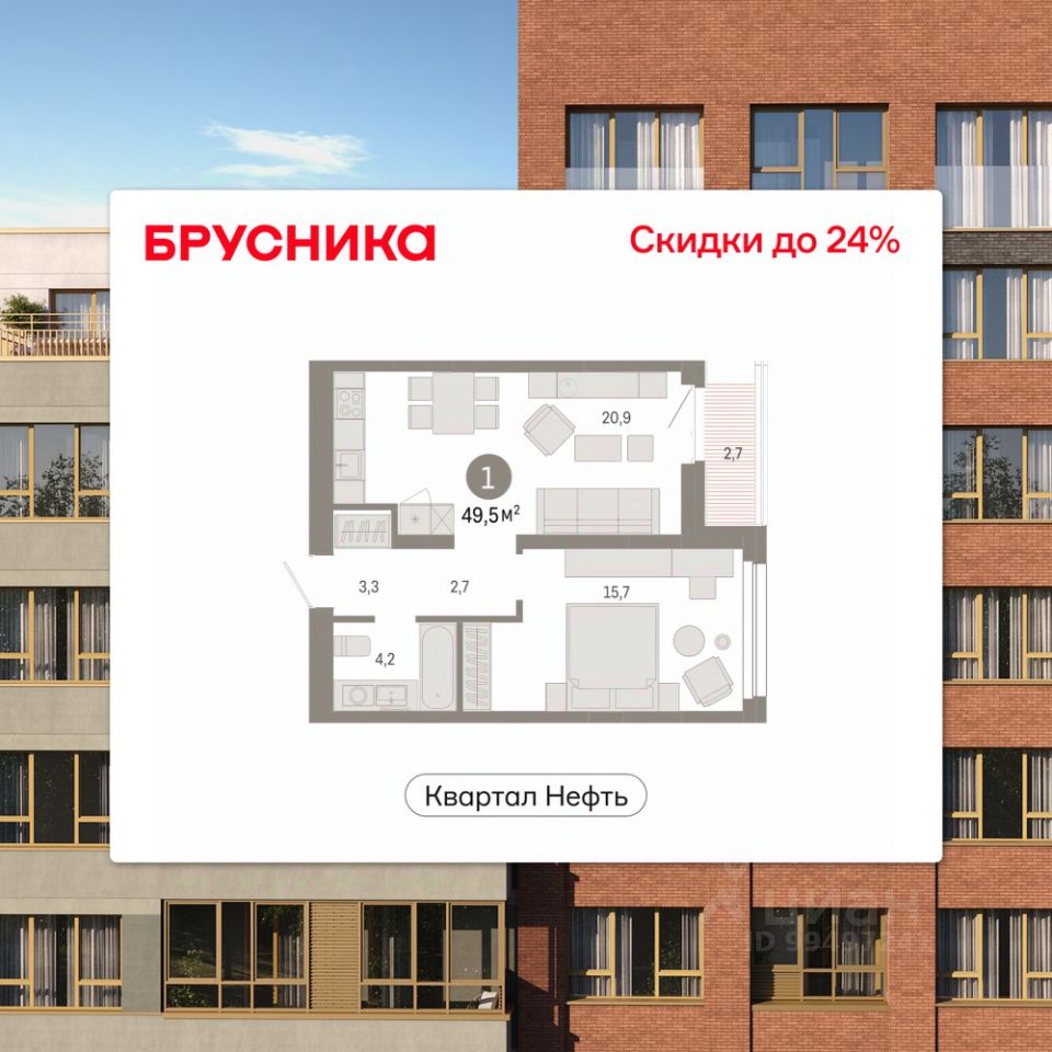 Просторная 1-комн. квартира с предчистовой отделкой в ЖК "Нефть" на 8 этаже. Общая площадь: 49.5 кв.м., жилая: 15.7 кв.м., площадь просторной кухни-гостиной: 20.9 кв.м. Все окна выходят на одну сторону. В квартире одна лоджия, один совмещенный санузел. Высота потолков 2.7 м.