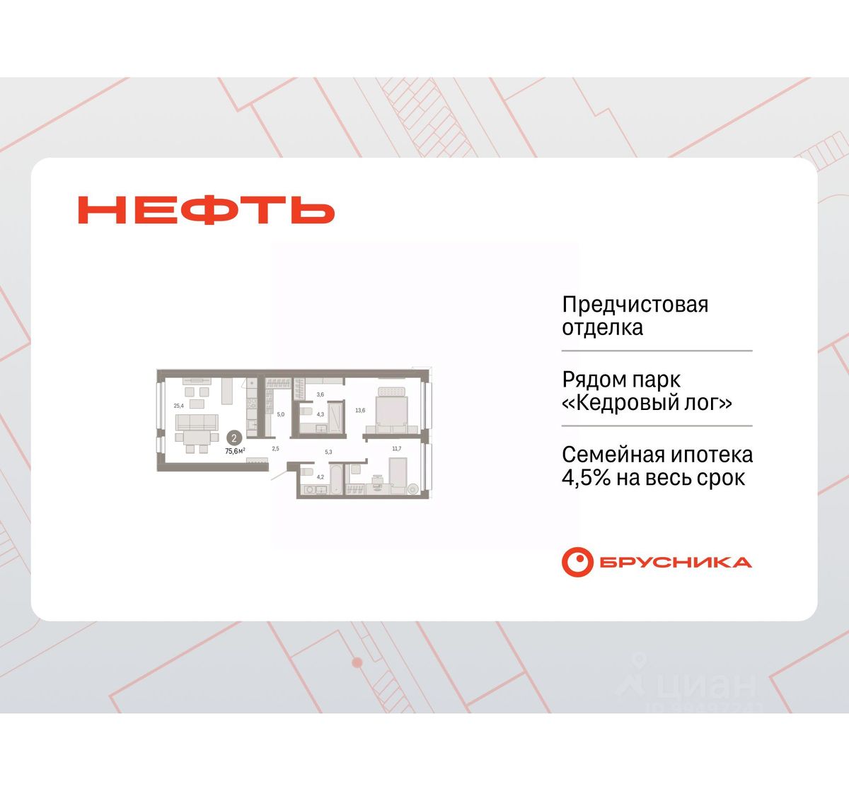 Двухкомнатная квартира от застройщика с предчистовой отделкой в ЖК "Нефть" на 2 этаже. Общая площадь: 75.6 кв.м., жилая: 25.3 кв.м., площадь просторной кухни-гостиной: 25.4 кв.м. Квартира - распашонка, без проходных комнат, окна выходят на paзные стороны дома. В квартире два совмещенных санузла. Высота потолков 2.7 м.