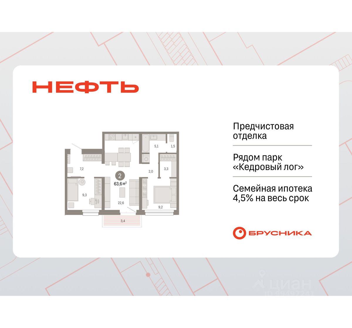 2-комн. квартира с предчистовой отделкой в ЖК "Нефть" на 7 этаже. Общая площадь: 63.6 кв.м., жилая: 18.5 кв.м., площадь просторной кухни-гостиной: 22.6 кв.м. Комнаты изолированные, все окна выходят на одну сторону. В квартире один балкон, один совмещенный санузел. Высота потолков 2.7 м.