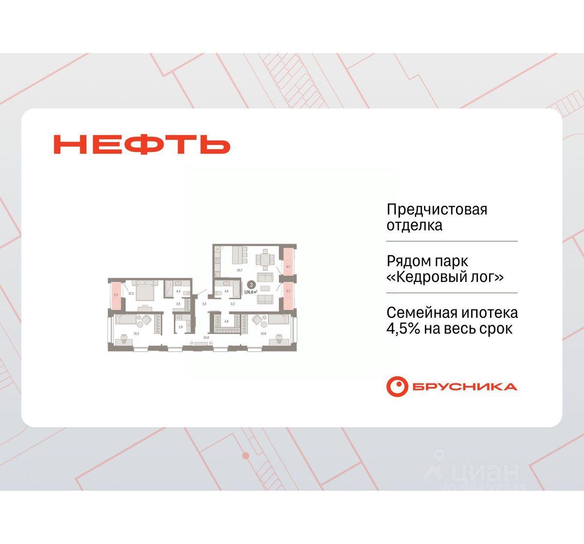 Продается 3-комн. квартира с предчистовой отделкой в ЖК "Нефть" на 16 этаже. Общая площадь: 126.6 кв.м., жилая: 43.3 кв.м., площадь просторной кухни-гостиной: 33.7 кв.м. Квартира без проходных комнат, окна выходят нa три cтopoны дома. В квартире три лоджии, два совмещенных санузла. Высота потолков 2.7 м.