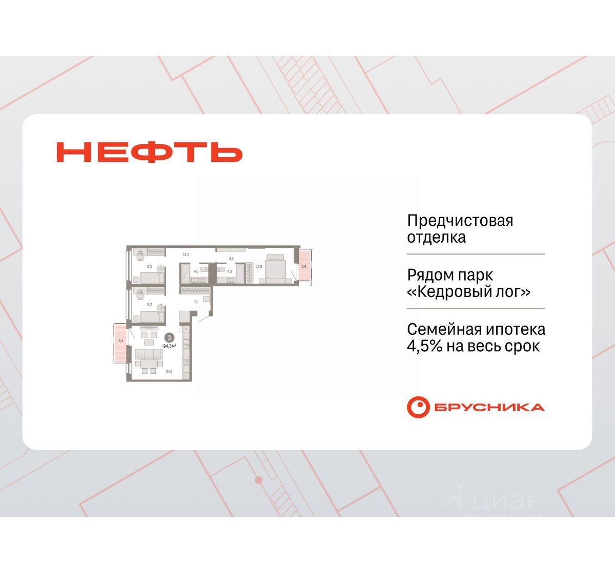 Квартира с кухней-гостиной и тремя спальнями в квартале "Нефть". Особенности планировки: вид во двор, разнесённые спальни, предчистовая отделка, мастер-спальня, балкон.