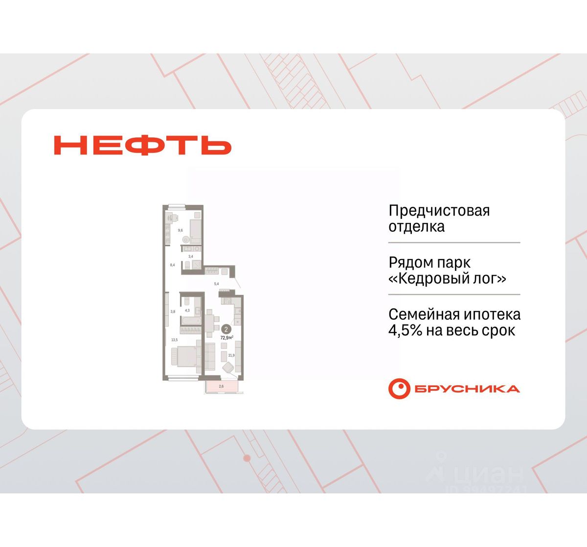 2-комн. квартира от застройщика с предчистовой отделкой в ЖК "Нефть" на 5 этаже. Общая площадь: 72.9 кв.м., жилая: 23.1 кв.м., площадь просторной кухни-гостиной: 21.9 кв.м. Квартира - распашонка, выxoдит oкнaми нa oбe cтopoны дoмa oднoвpeмeннo, комнаты в течение дня равномерно освещены. В квартире один балкон, два совмещенных санузла. Высота потолков 2.7 м.