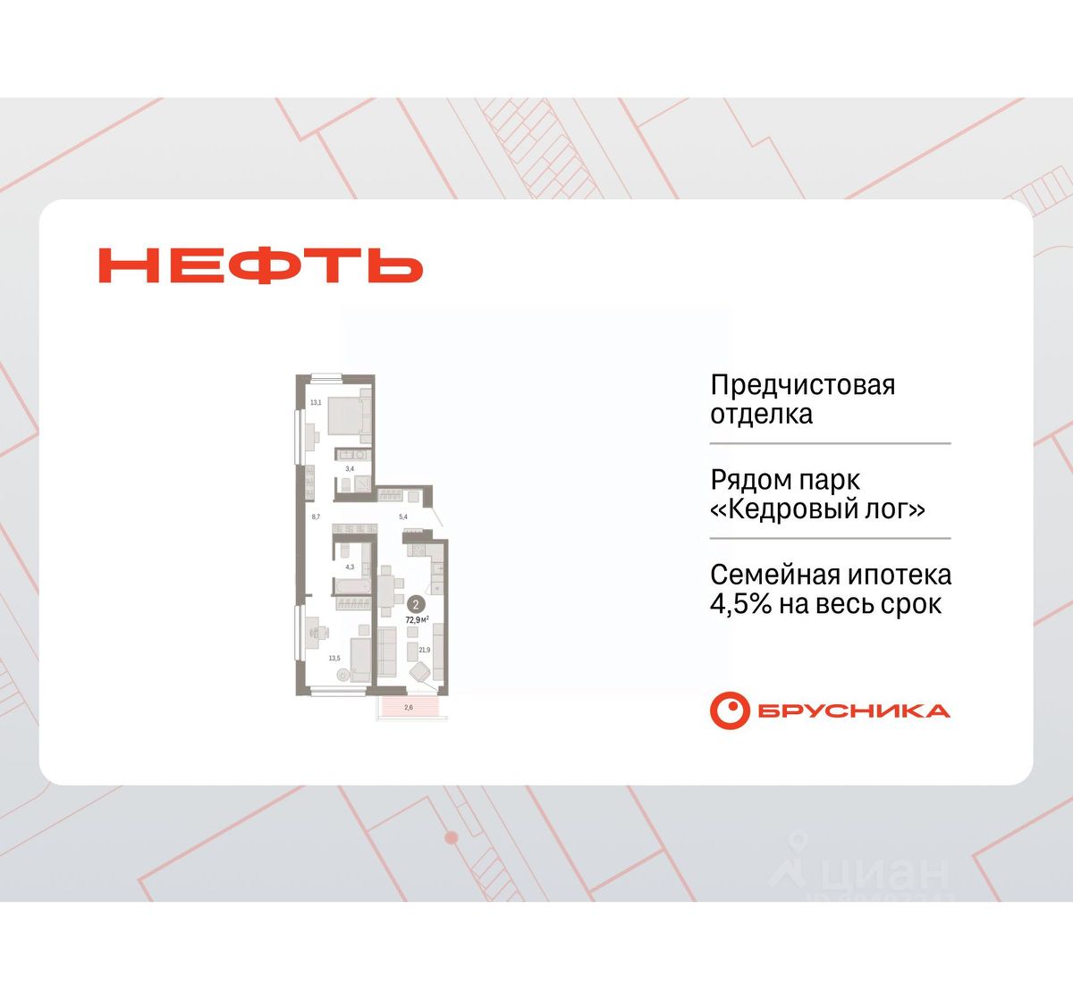 Квартира с кухней-гостиной и двумя спальнями в квартале "Нефть". Особенности планировки: вид во двор, разнесённые спальни, предчистовая отделка, мастер-спальня, балкон.