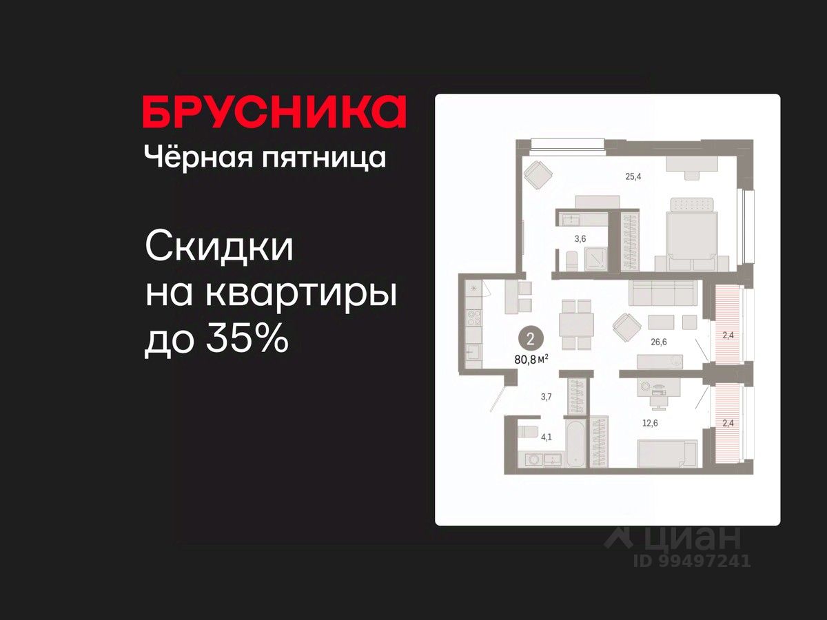 Квартира с кухней-гостиной и двумя спальнями в квартале "Нефть". Особенности планировки: лоджия, разнесённые спальни, предчистовая отделка, мастер-спальня.