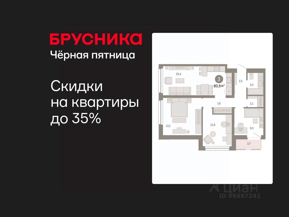 Квартира с кухней-гостиной и тремя спальнями в квартале "Нефть". Особенности планировки: гардеробная, рабочий кабинет, лоджия, разнесённые спальни, предчистовая отделка.