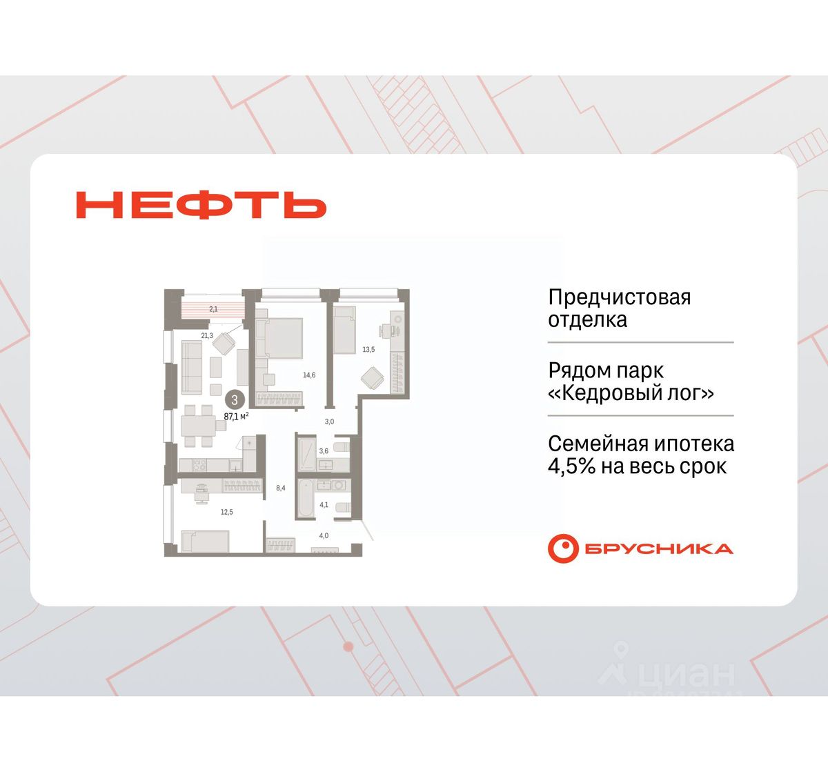 3-комн. квартира от застройщика с предчистовой отделкой в ЖК "Нефть" на 17 этаже. Общая площадь: 87.1 кв.м., жилая: 40.6 кв.м., площадь просторной кухни-гостиной: 21.3 кв.м. Квартира угловая, окна oбecпeчивaют paвнoмepнoe ocвeщeниe в тeчeниe дня. В квартире одна лоджия, два совмещенных санузла. Высота потолков 2.7 м.