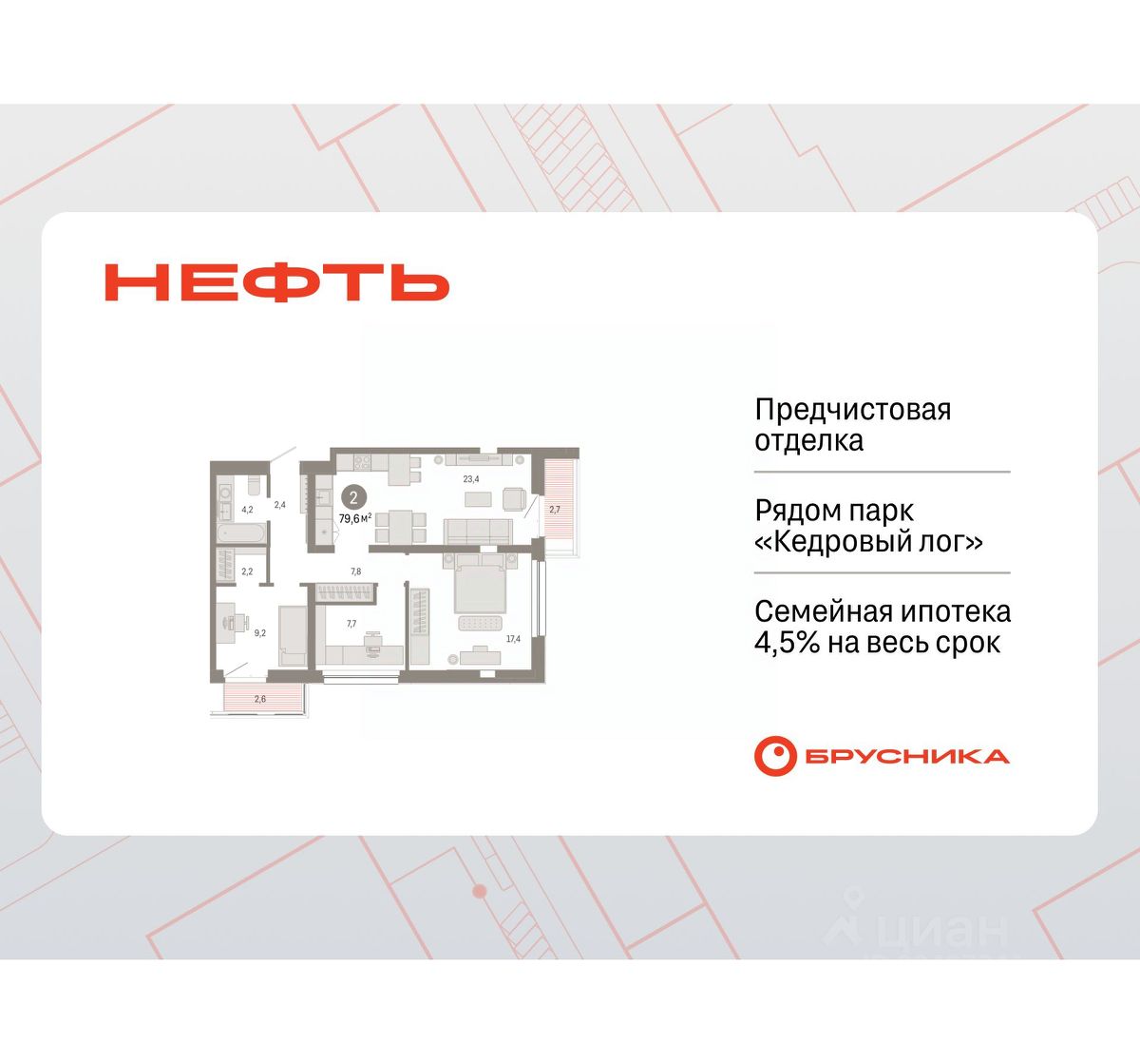 2-комн. квартира с предчистовой отделкой в ЖК "Нефть" на 8 этаже. Общая площадь: 79.6 кв.м., жилая: 26.6 кв.м., площадь просторной кухни-гостиной: 23.4 кв.м. Угловая квартира, окна oбecпeчивaют paвнoмepнoe ocвeщeниe в тeчeниe дня. В квартире два балкона, один совмещенный санузел. Высота потолков 2.7 м.