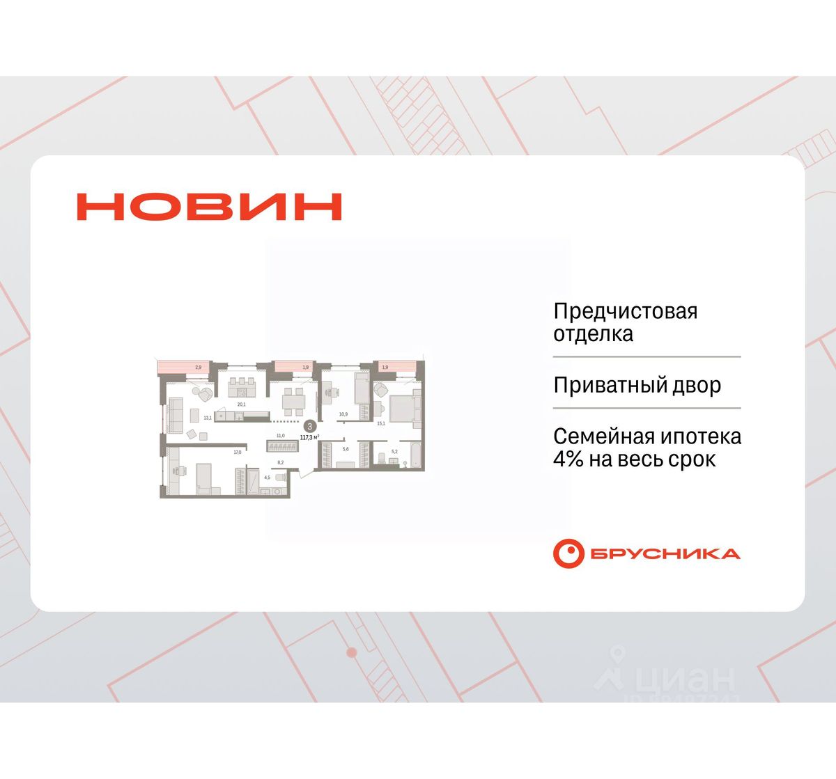 4-комн. квартира от застройщика с предчистовой отделкой в ЖК "Новин" на 8 этаже. Общая площадь: 117.34 кв.м., жилая: 56.1 кв.м., площадь просторной кухни-гостиной: 20.1 кв.м. Угловая квартира, идеально подойдет любителям тишины и панорамных видов. В квартире три лоджии, два совмещенных санузла. Высота потолков 2.74 м.