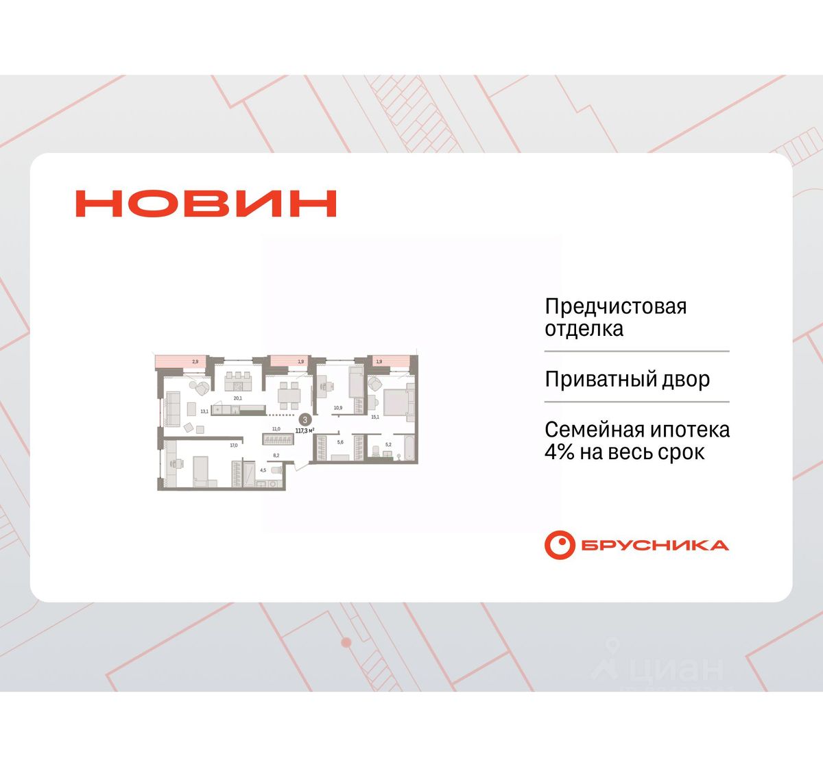 Продается 4-комн. квартира с предчистовой отделкой в ЖК "Новин" на 7 этаже. Общая площадь: 117.33 кв.м., жилая: 56.1 кв.м., площадь просторной кухни-гостиной: 20.1 кв.м. Квартира угловая, очень светлая, естественная вентиляция при открытии окон. В квартире три лоджии, два совмещенных санузла. Высота потолков 2.74 м.